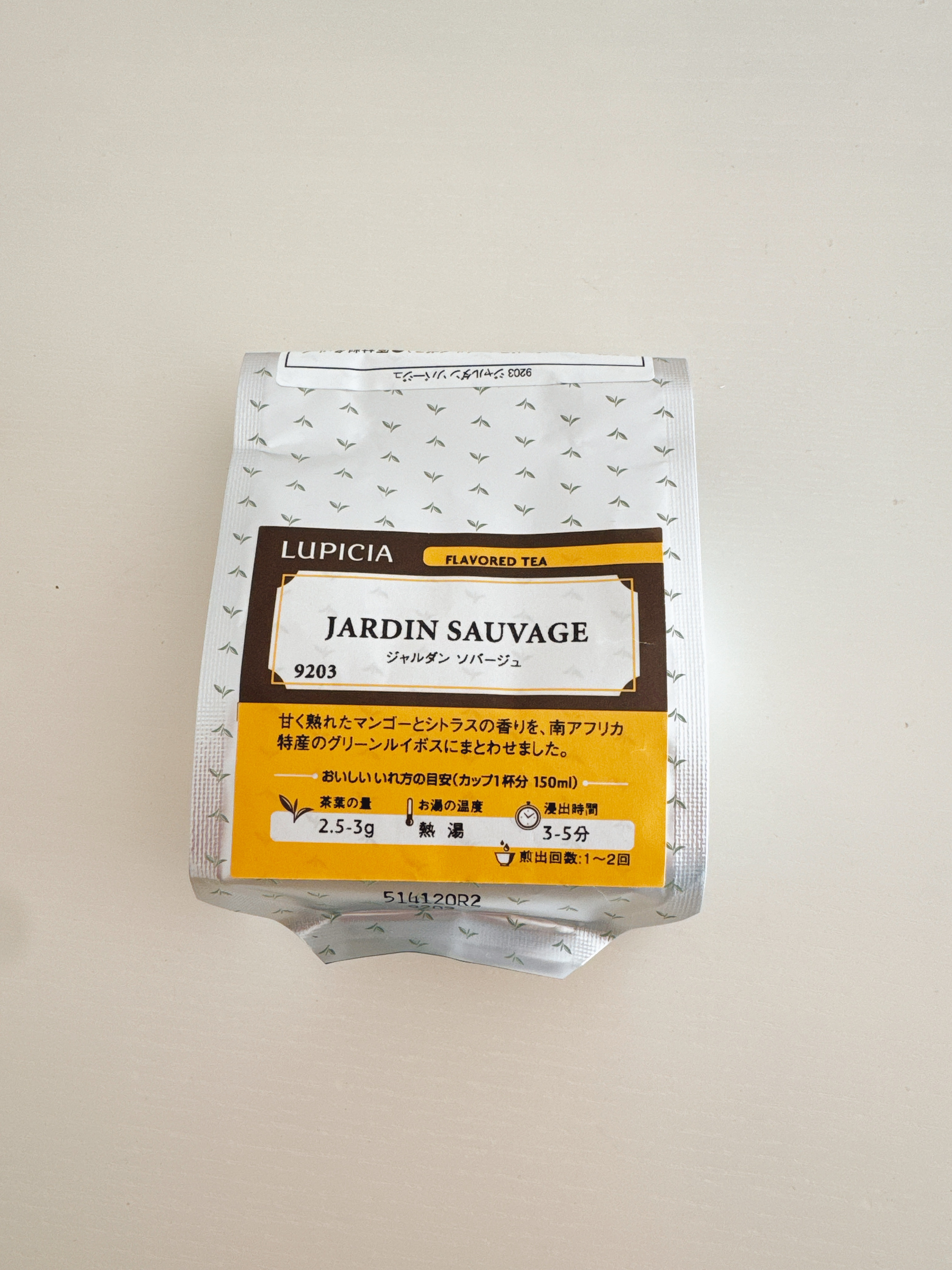 ルピシアの「ジャルダン・ソバージュ」はグリーンルイボスに、甘く熟れたマンゴーと爽やかなシトラス系の香りのお茶で、ノンカフェインです♪ほっとするお茶でお勧めです。